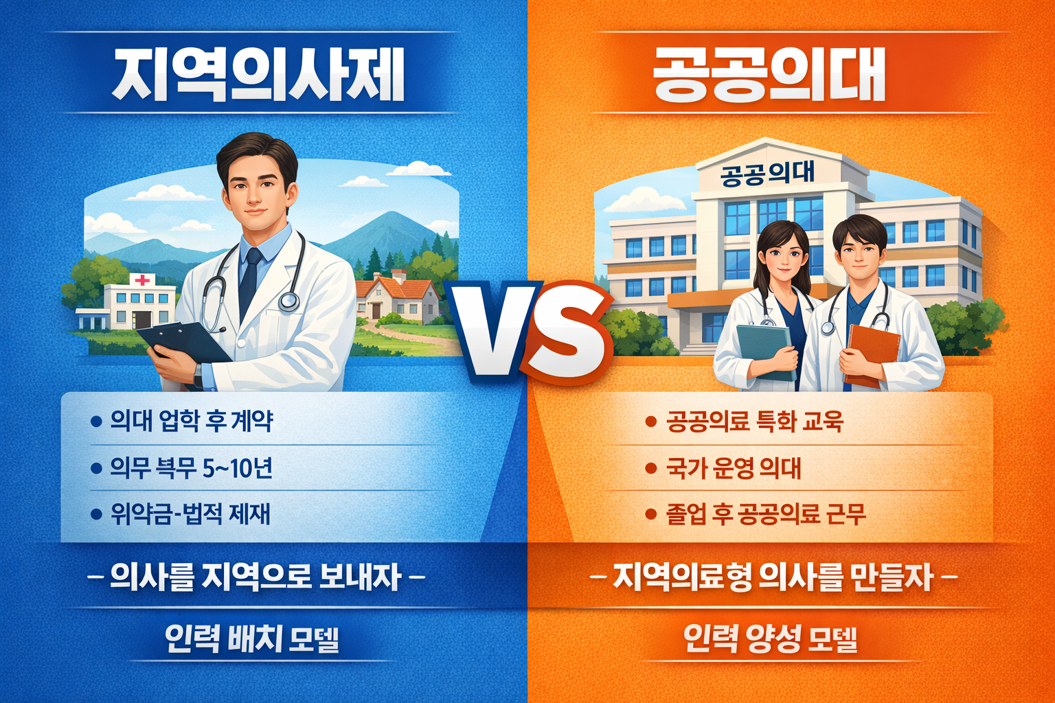두 제도 모두 지역 의료 격차 해소와 필수의료 인력 확보라는 공통 목적을 가지고 있지만, 구조·방식·정책 철학은 완전히 다릅니다.